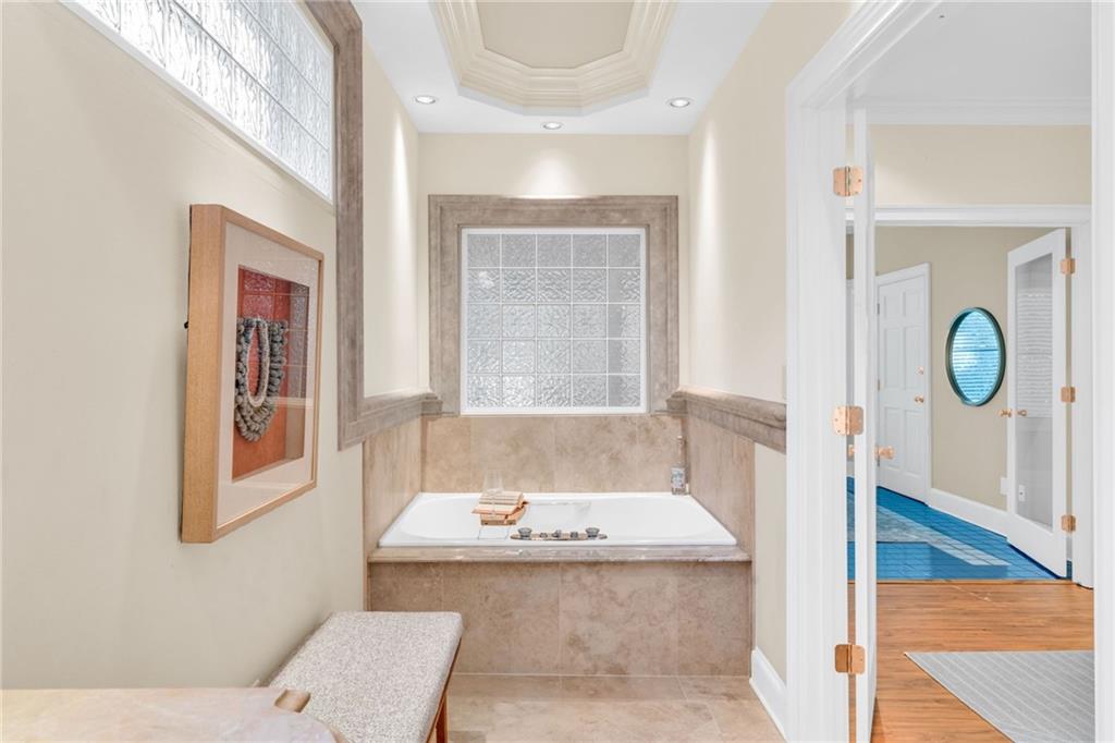 JennAir cooktop, indoor gas grill, and professional-grade refrigerator and freezer. Smartly designed cabinetry provides abundant storage, making this kitchen as practical as it is elegant. Also on the main level are a convenient powder room, laundry area, and two-car garage with easy access to the living space. The lower level is a true retreat. The primary suite features a large walk-in closet and a spa-like bath with a whirlpool tub, separate walk-in shower, and